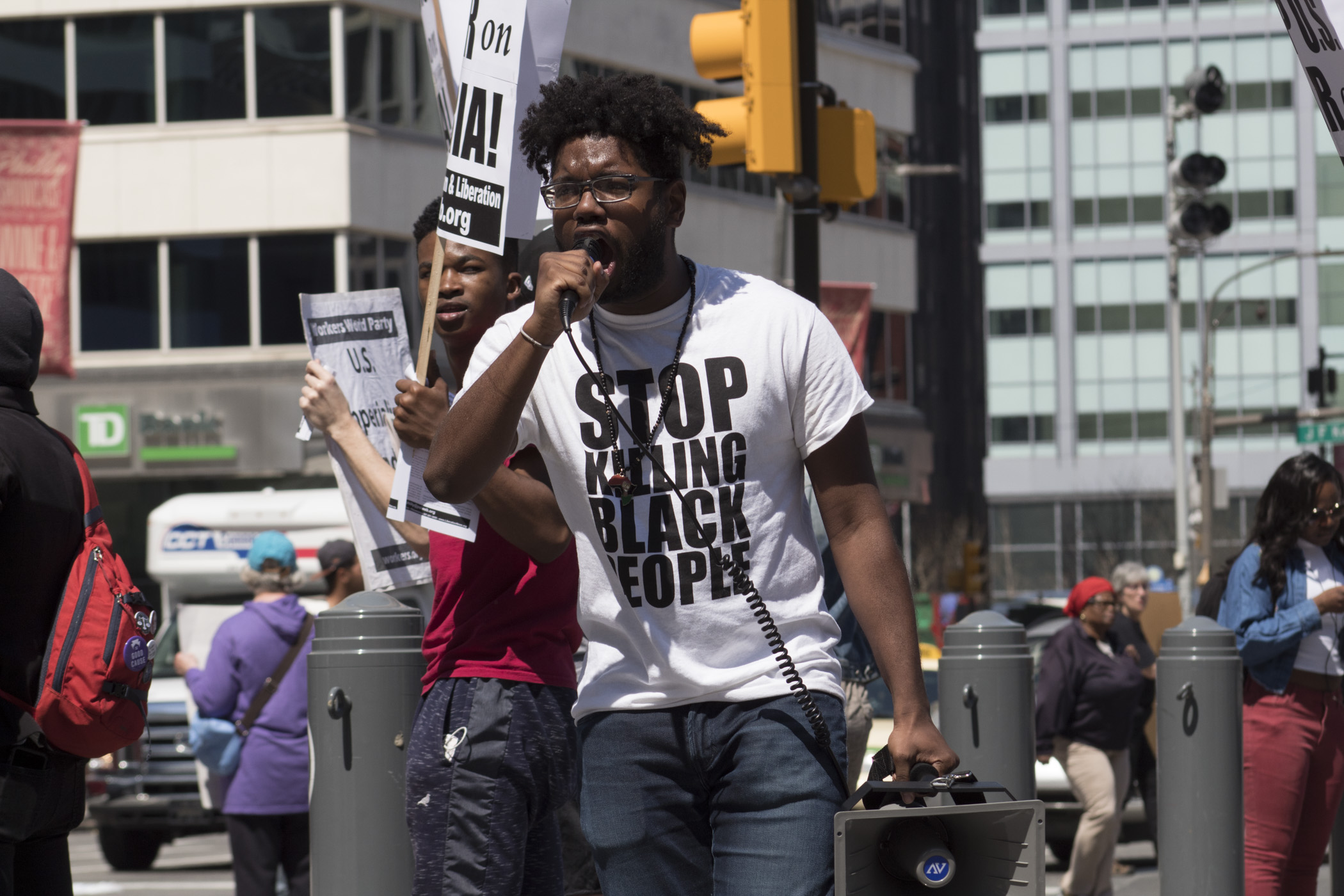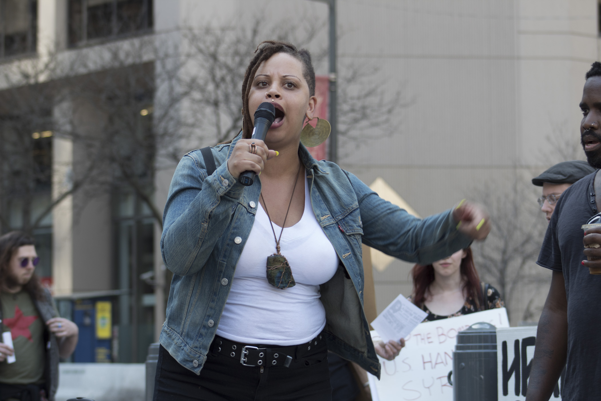 A speaker from the Philly Coalition for REAL Justice speaks in front of the crowd.