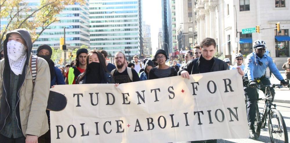 Image caption: protesters march behind a banner that reads “students for police abolition