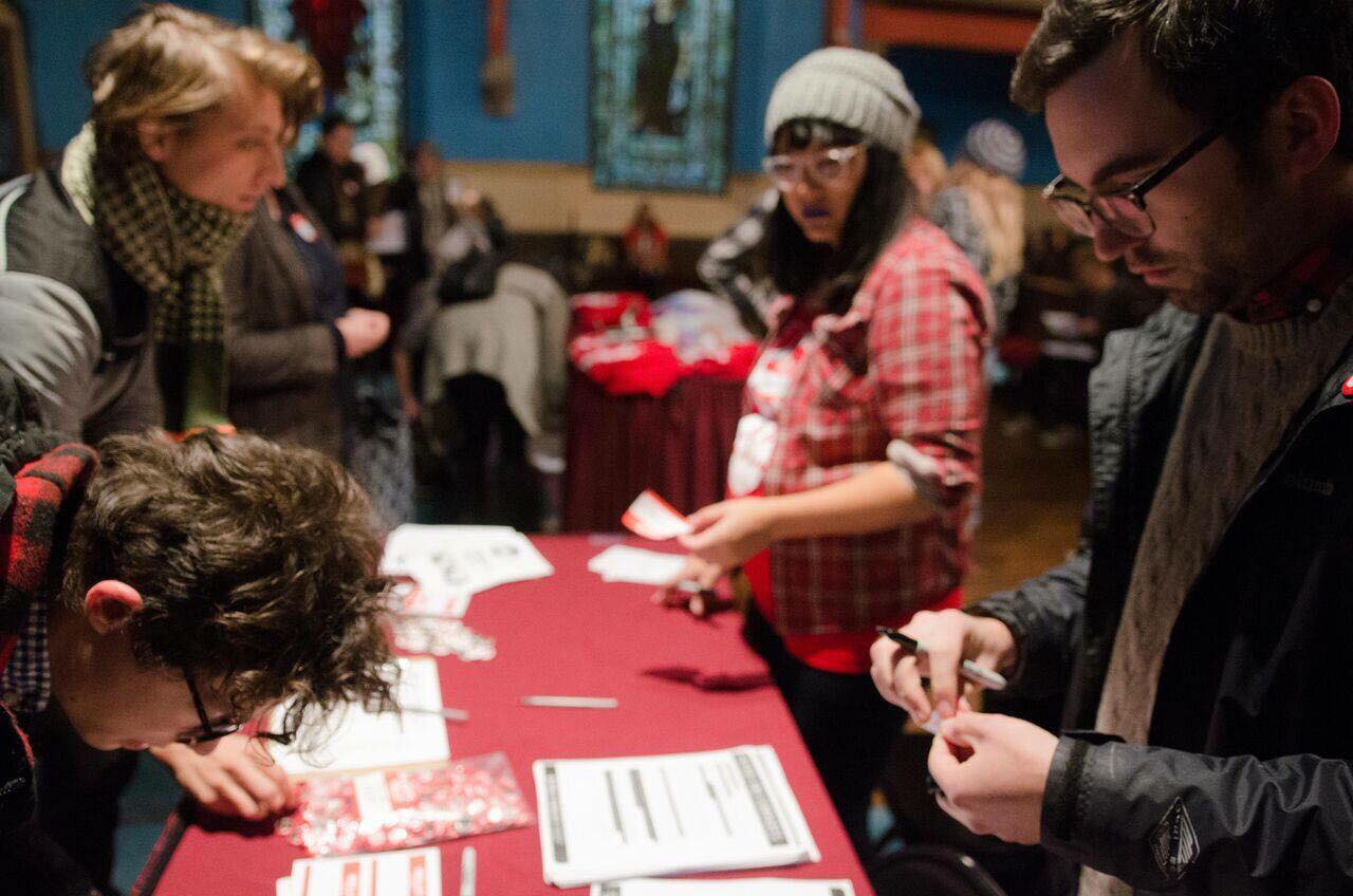 Image caption: organizers work a table at a Philly Socialists gathering.