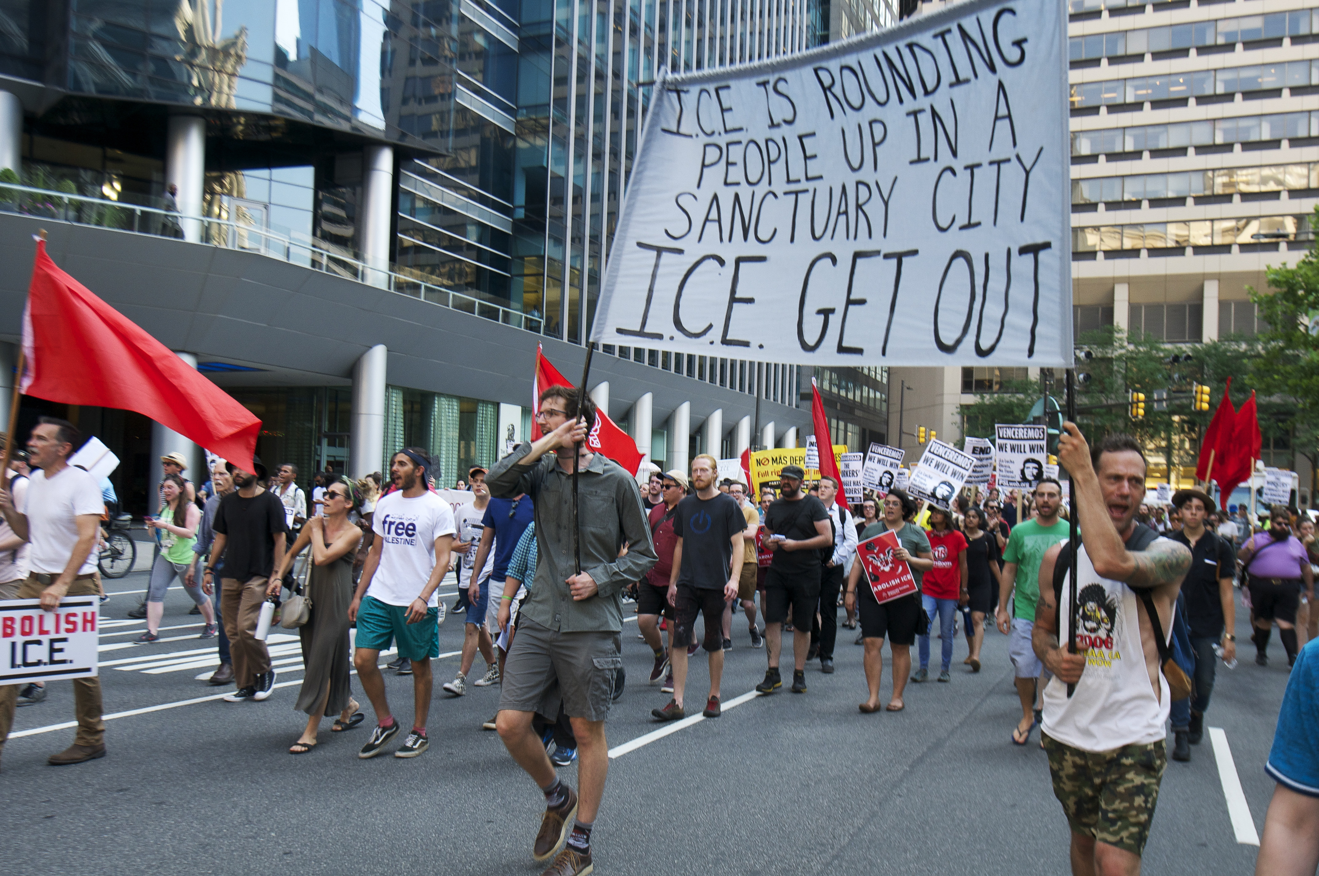 Image caption: Red flags pepper a crowd with a large banner in the foreground reading “ICE IS ROUNDING PEOPLE UP IN A SANCTUARY CITY ICE GET OUT”