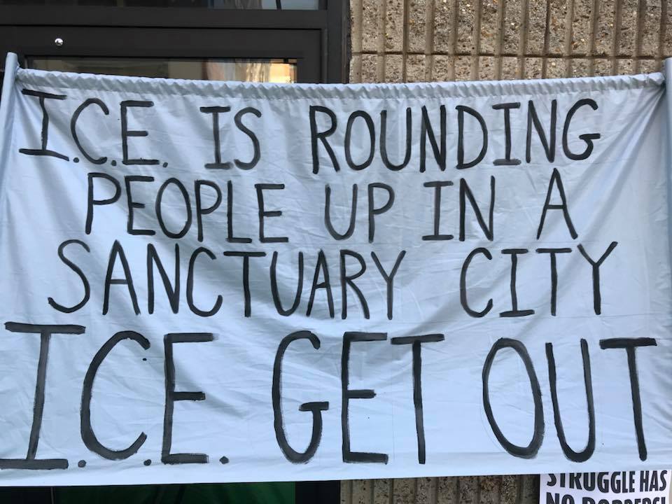 Image caption: on a white cloth banner is written “I.C.E. IS ROUNDING PEOPLE UP IN A SANCTUARY CITY I.C.E. GET OUT”