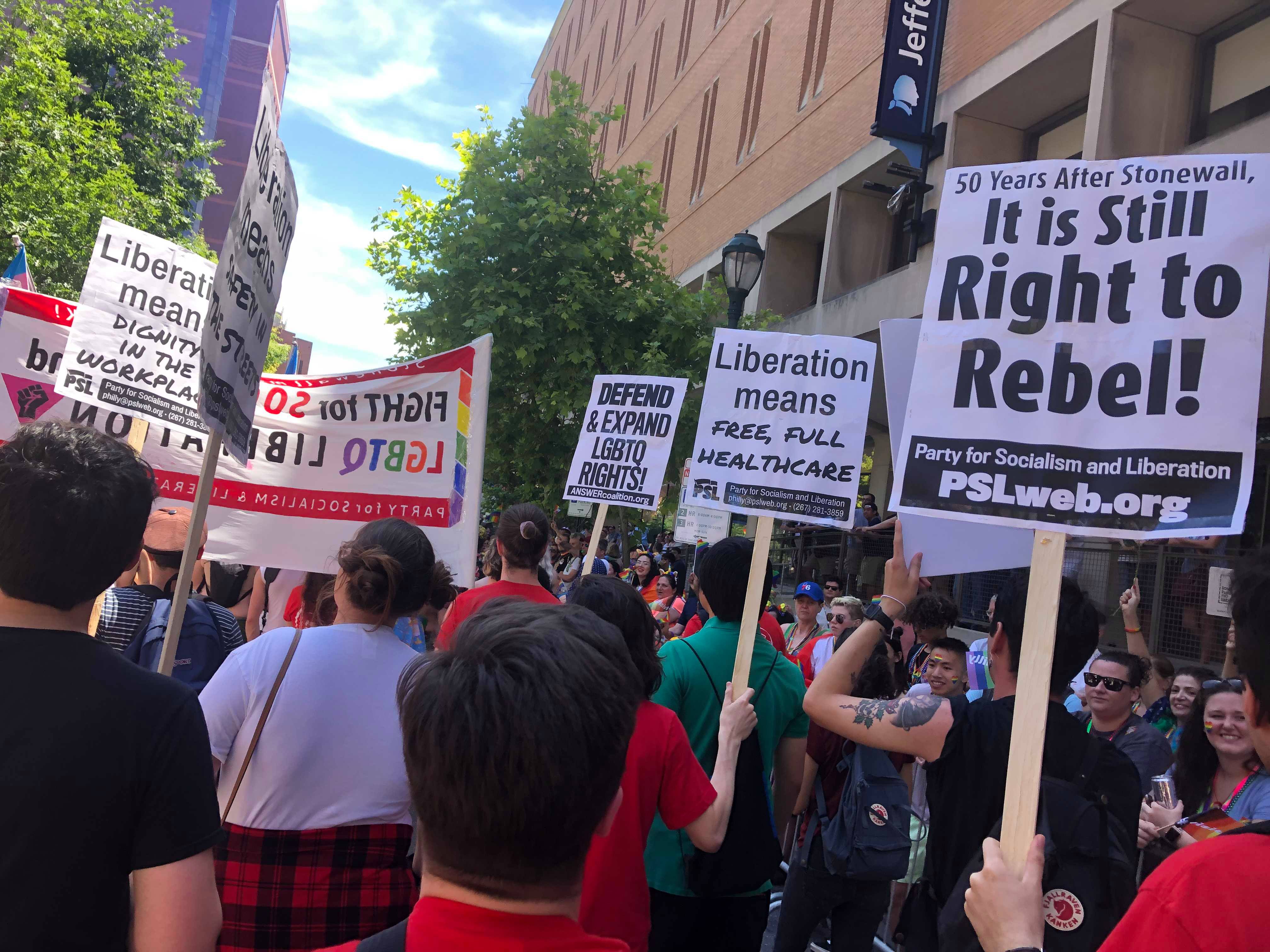 The Party for Socialism and Liberation (PSL), members of Philly Socialists, and other activists formed the Socialist Contingent to march in the Pride Parade. This coalition aimed to celebrate the queer community, but also to thrust into public view the belief that socialist politics are crucial for queer liberation. “The corporations that fund Pride parades aren’t gonna save us, but socialist policies that provide healthcare, housing, and rights will,” stated Angel Nalubega, an organizer with the PSL. “I think that, at its roots, Pride started as a riot, as a group of oppressed people fighting back,” they went on to say. Recovering the rebellious spirit of the founders of the Gay liberation movement in the 1960s, such as Stormé Delarverie and Marsha P. Johnson, was one of Angel’s goals in marching in the Pride parade.