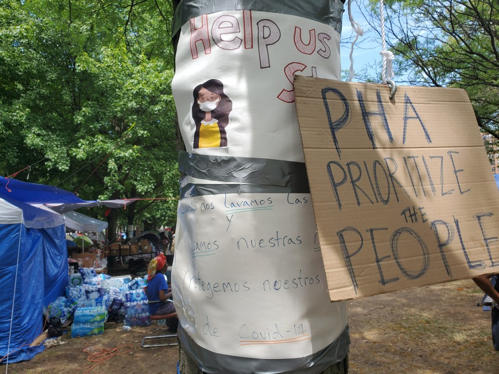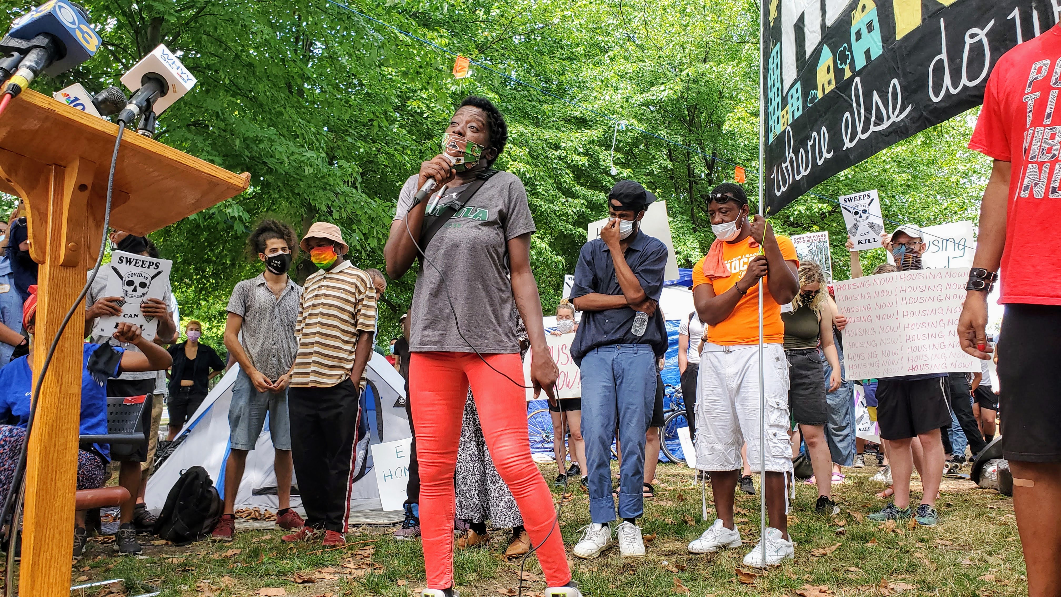 Black has felt the pressure of organizing during an intersection of crises: both health and housing. “It’s kind of hard, knowing that I’m not just speaking for myself, I am speaking for every individual that is homeless out here, that’s 200+ that we have out here.” Of the camp residents, the vast majority were unhoused prior to the encampment. “This is not a protest for us,” Black says. While many do identify their occupation as a protest, Black feels she never made an active choice to protest. “This is just the means that is necessary for us to have a stable household. To have a stable job.”