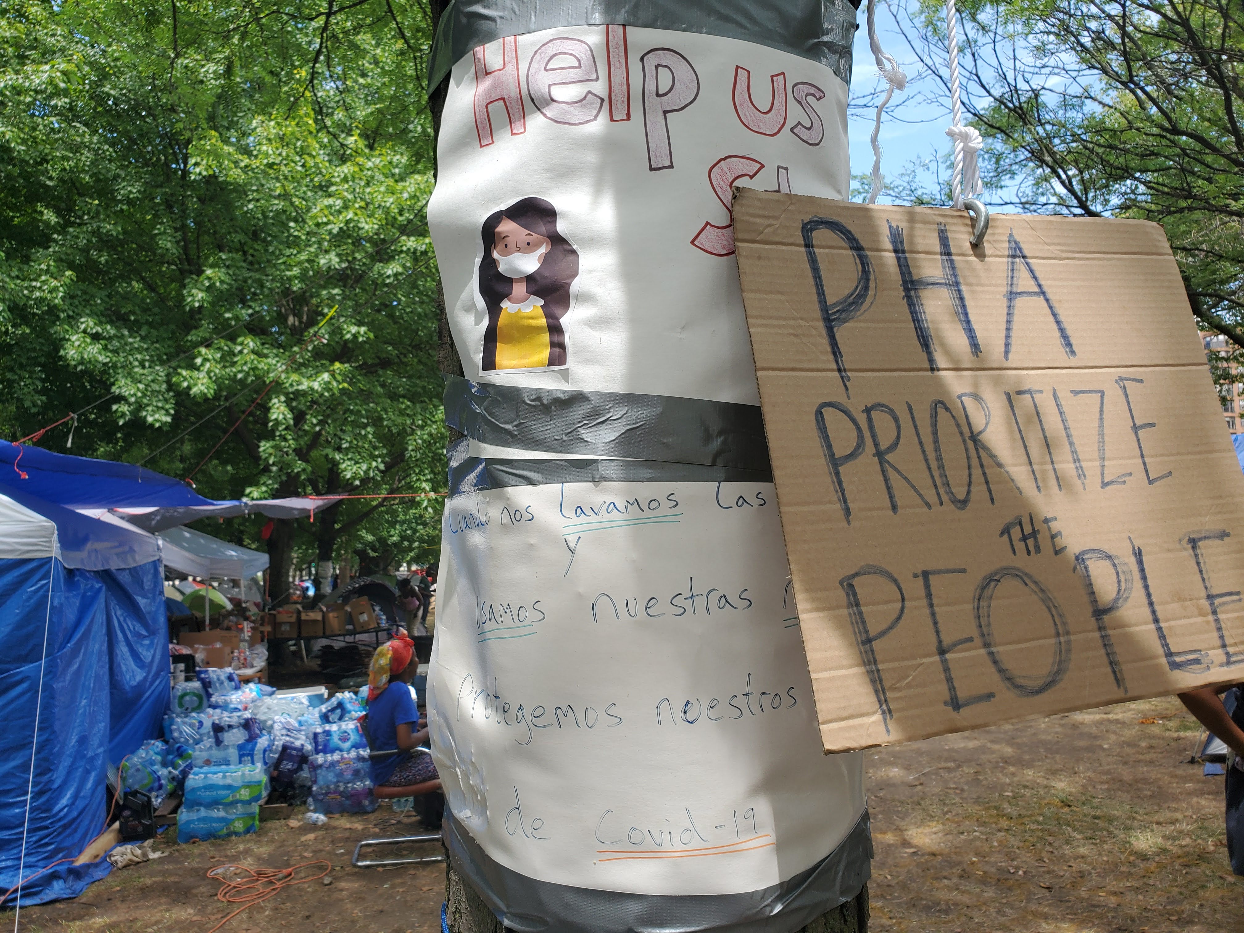 In the past week in Philadelphia, a group of homeless people have begun building homes for themselves. They are determined to defend their new homes, and more than that, they are ready to take the fight to the city to make sure everyone has decent housing. An encampment of mostly tents and tarps has been constructed around the baseball cage in the Southeast edge of Von Colln Memorial Field, on the corner of 22nd Street and Ben Franklin Parkway. This encampment has grown rapidly, with around 50 tents and tarp structures housing both residents and supplies, all in the shade of the beech trees along the Parkway, one of Philadelphia’s central thoroughfares. Based on the information provided to me by the organizer Alex and volunteer Teddy, the plan to construct the camp went into motion on Monday, June 8th. The camp was established and taking in residents by Wednesday, June 10th. My main intention for writing an account of the camp and its direction is to preemptively avoid both the genuine confusion and the targeted misinformation to which these kinds of space-taking projects are seemingly vulnerable.