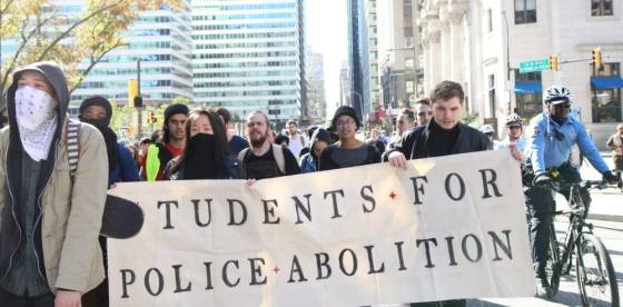 Image caption: protesters march behind a banner that reads “students for police abolition By Tim Horras; Photo by Danielle Corcione … More