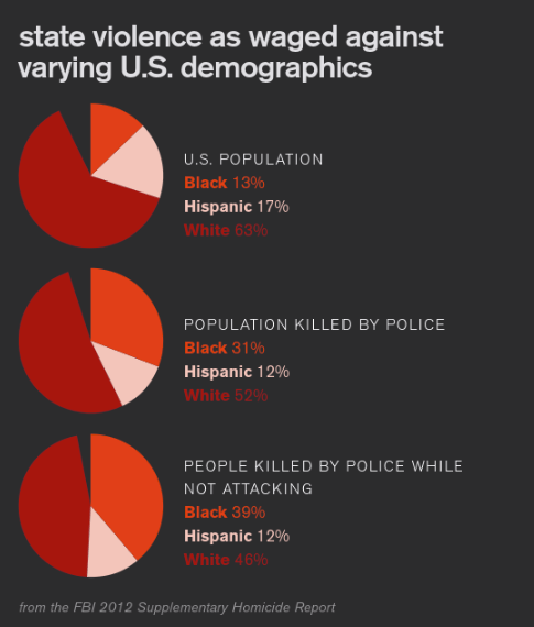 Image caption: “state violence as waged against varying U.S. demographics” featuring three pie charts. First chart reads “U.S. population: Black … More
