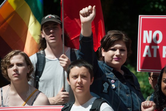 Image caption: ReeAnna Segin raises a fist of solidarity, flanked by fellow protestors. A red socialist flag and a Philly-style Pride … More
