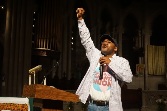 Image caption: Philadelphia Tenants Union Vice President Barry Thompson has his fist raised in the air as he speaks into … More
